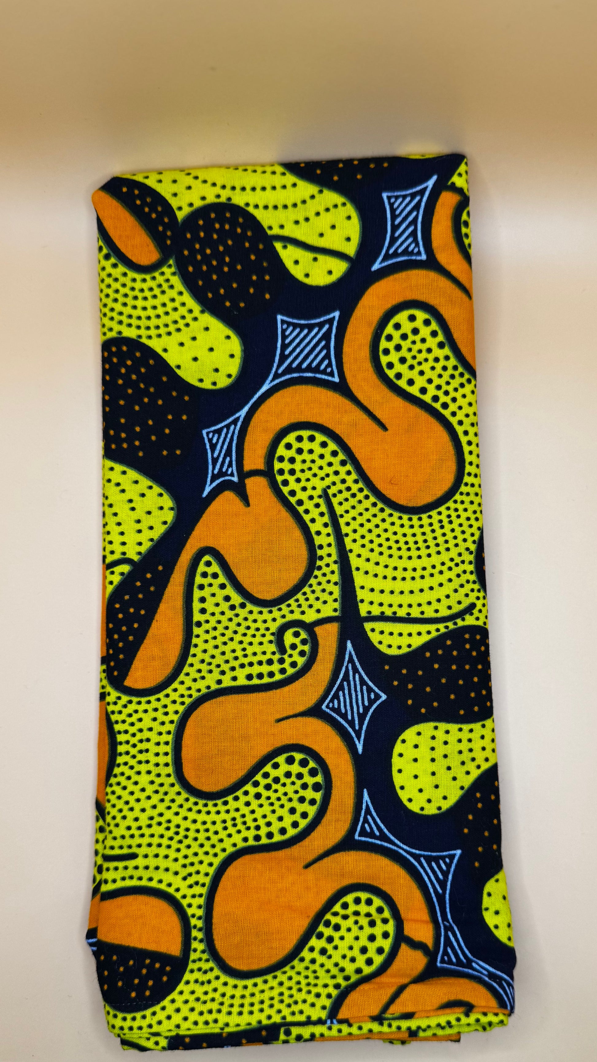 Command the room with Golden Majesty, a stunning head wrap drenched in warm orange and lime tones that glow like the sun. Its swirling pattern symbolizes bold movement and unstoppable energy. Perfect for the queen who shines effortlessly.