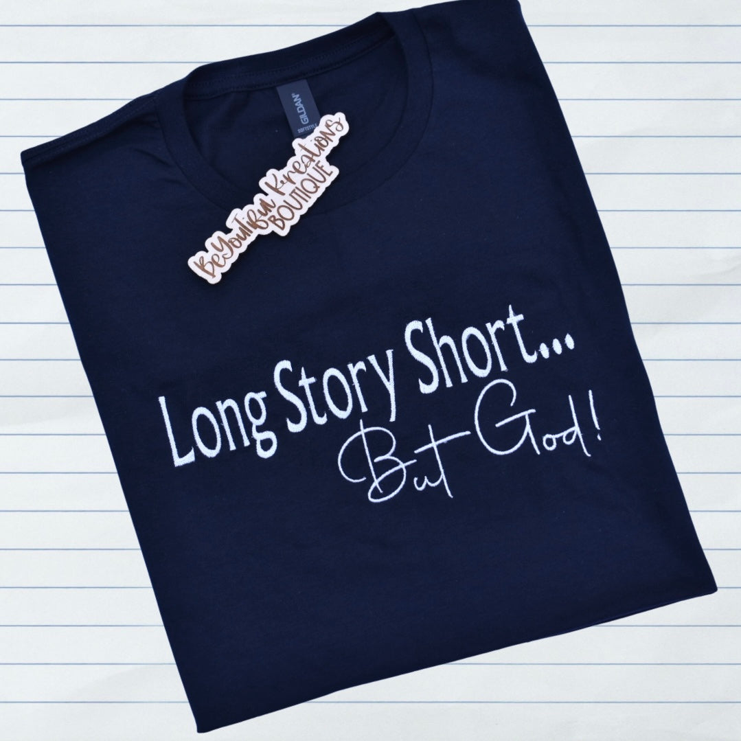 “Long Story Short… But God! Embroidered Tee”