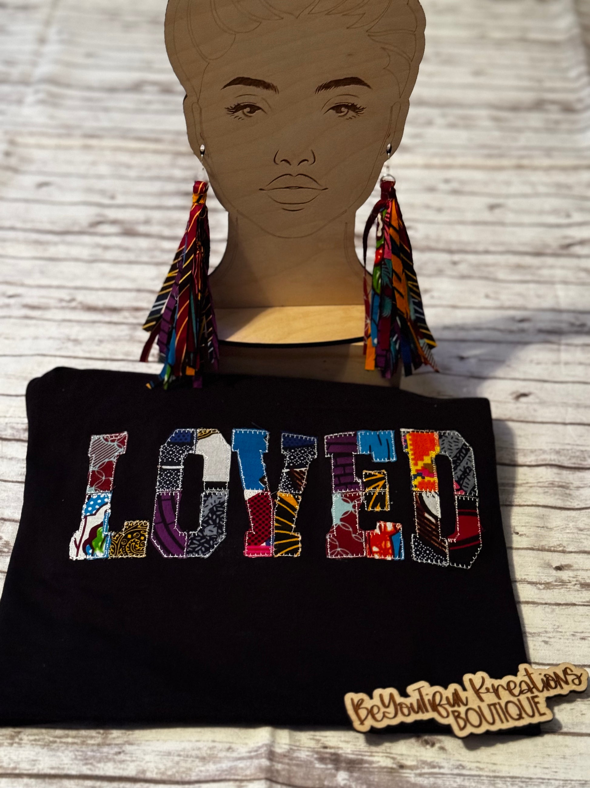 A bold reminder that nothing can separate you from God’s love. The “LOVED” appliqué tee is stitched with vibrant patchwork Ankara prints—each piece uniquely sewn, just like your story.