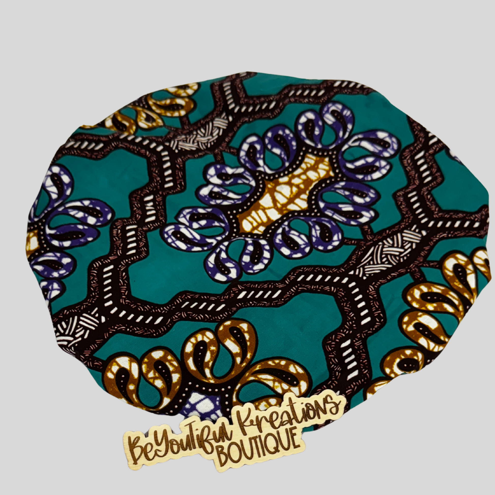 Make your nights bold and graceful with the Nia Grace Satin-Lined Ankara Bonnet. Featuring a rich teal base with striking gold and purple patterns, it keeps your hair protected while adding a touch of elegance to your routine.