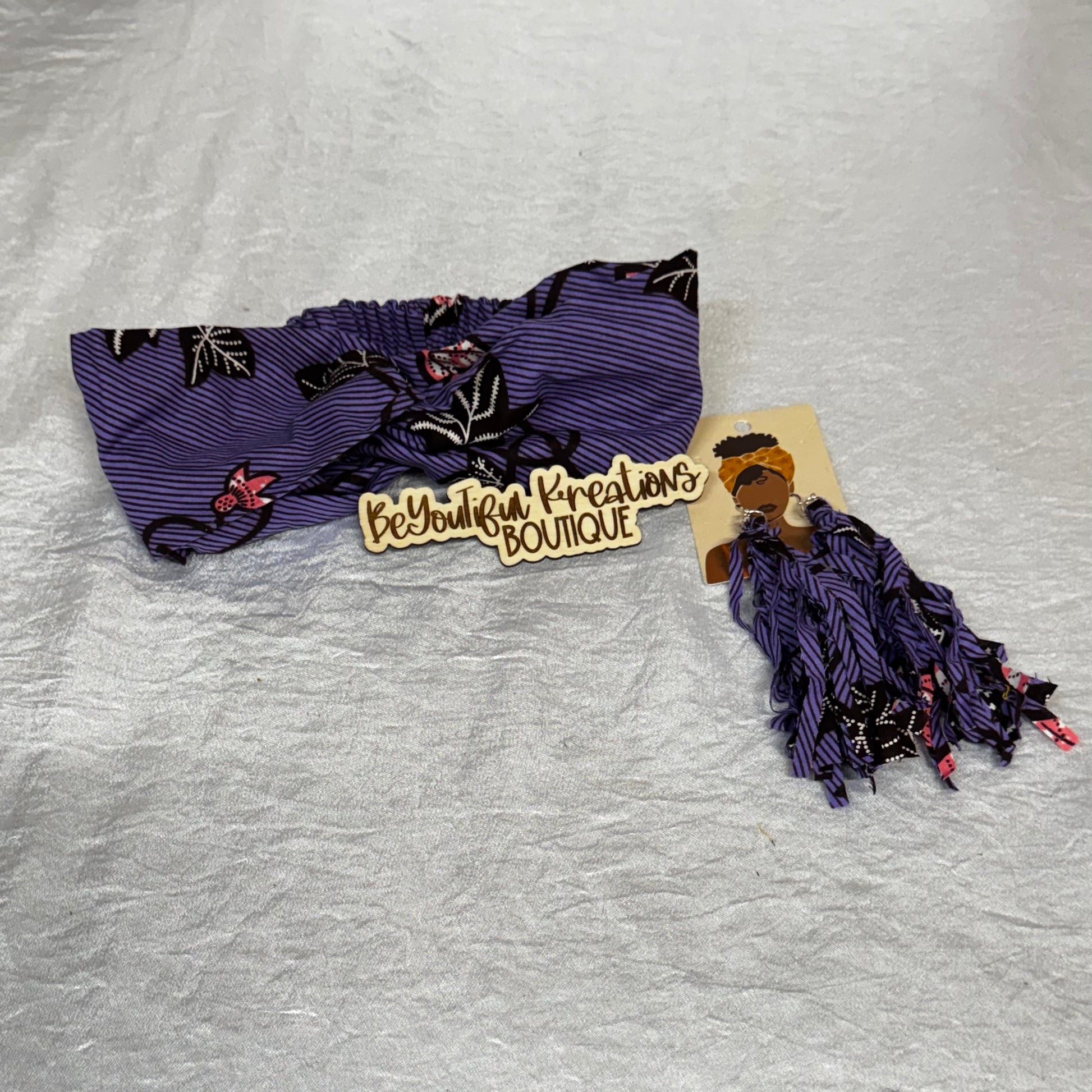 Step into subtle elegance with our “Royal Bloom” Ankara Headband & Fringe Earring Set. Crafted in a rich lavender and black floral print with delicate pink accents, this set is the perfect blend of bold and soft. The twist-front elastic headband offers all-day comfort and style, while the flowy fringe earrings add a lightweight touch of drama. Handmade to stand out, this set brings a graceful finish to both casual and dressy looks.
